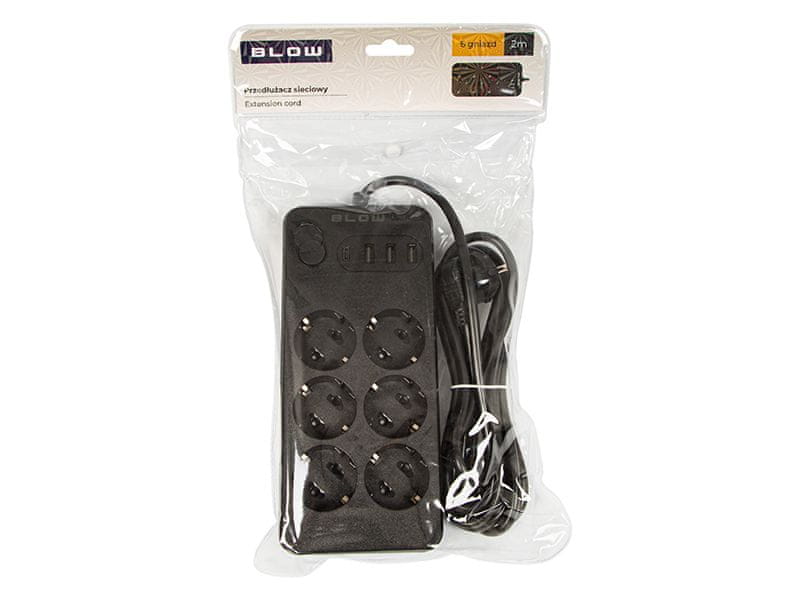 BLOW črn omrežni podaljšek s šestimi vtičnicami za domačo uporabo. S podaljševalnikom lahko priključite naprave, ki so oddaljene od električne vtičnice. Izdelek ima 6 kotnih vtičnic in stikalo za vklop/izklop na eni strani ter en kotni omrežni vtič na drugi strani.