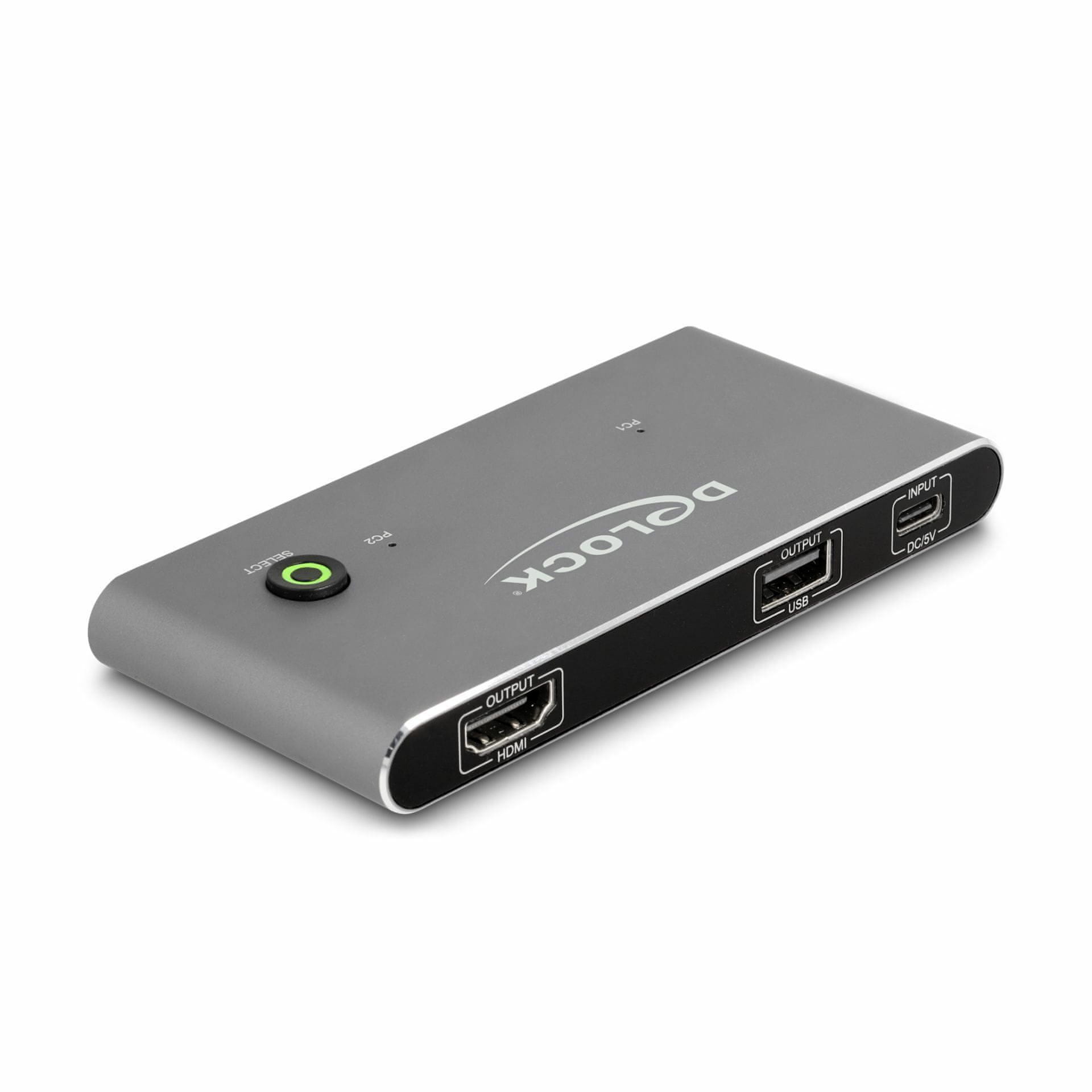 KVM stikalo Delock je priročna rešitev za povezavo dveh računalnikov z izhodom USB TipC DP Alt Mode na HDMI monitor. Z gumbom lahko preklapljate med obema računalnikoma. Poleg ima tri izhode USB 2.0 za miško in tipkovnico ali USB-pomnilnik. Naprava se napaja prek USB vhoda s priloženim USB kablom.