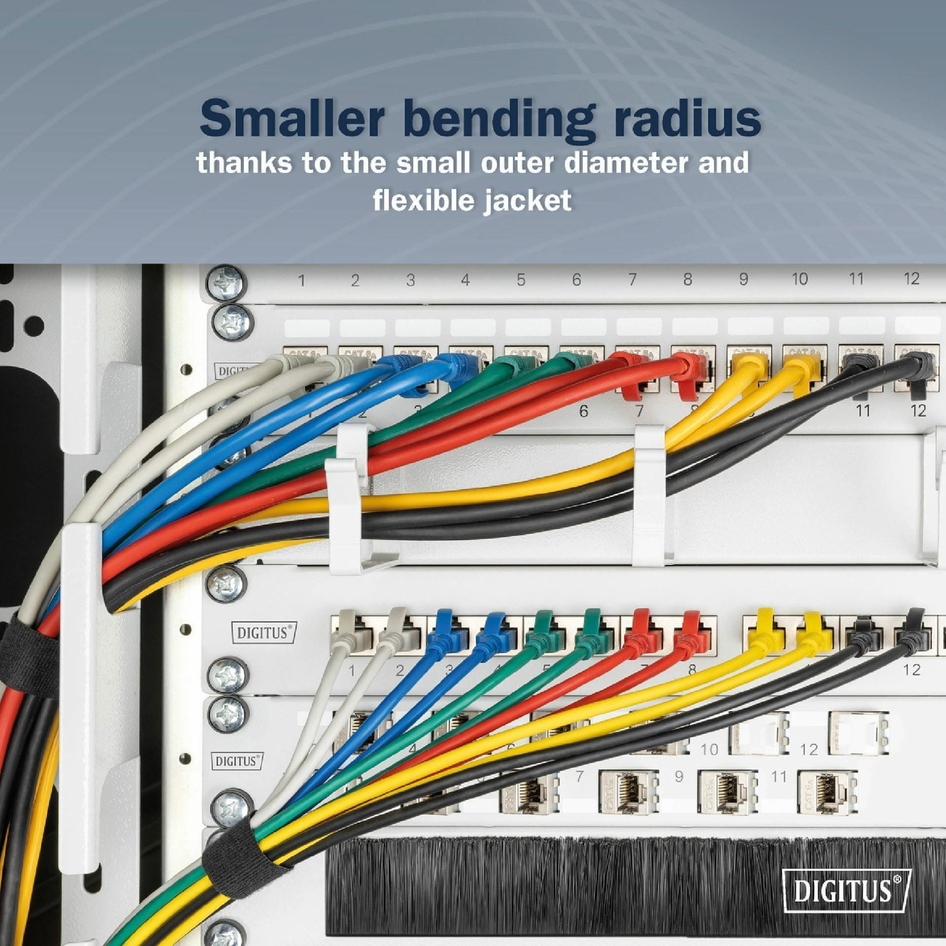 Digitus mrežni F/FTP kabel CAT.6A je zaradi majhnega zunanjega premera 3,8 mm optimalen za uporabo v komunikacijskih omarah. Fleksibilna zasnova omogoča učinkovitejšo organizacijo kablov ter zmanjšuje porabo prostora. Omogoča hitrost prenosa do 10 Gbit/s na frekvenci 500 MHz in je primeren za PoE+ napajanje.