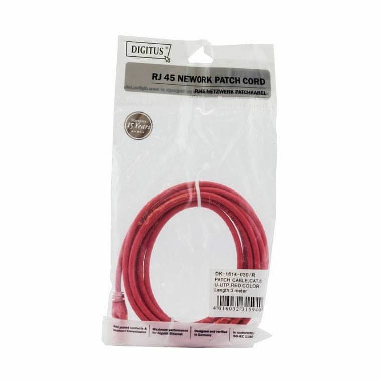 Digitus kvaliteten povezovalen UTP kabel CAT6 z mehko žico in 100% bakrenim prevodnikom za mrežno povezavo. Kabel je certificiran in ponuja možnost 15-letne sistemske garancije ter je primeren za pisarne in domačo uporabo.