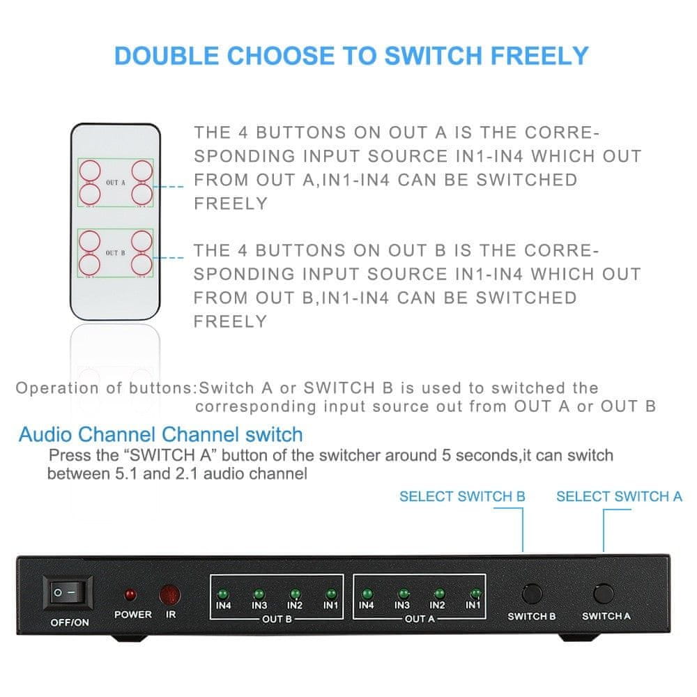 • deluje v načinu switcher (preklopnik) ali splitter (razdelilec – razdeli en vhod na dva izhoda)