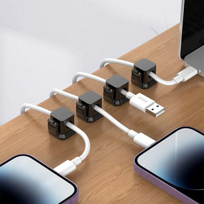 • Uporaba: Pripomoček lahko s pomočjo samolepilne zasnove nalepite na katerokoli ravno površino: les, steklo, kovina, plastika, usnje, ploščice itd. V zatič oz. luknjo vstavite kabel. Primeren je za različne namene: kabel od miške, slušalk, polnilcev, električnih kablov itd. Primeren za kable premera približno 6,5 mm. Kabel namestite tako, da s pritiskom na zgornji del odprete odprtino, notri vstavite kabel in jo zaprete.