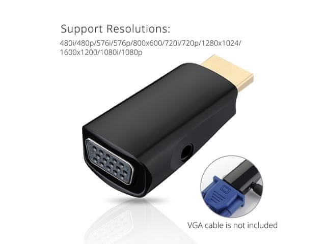Kompakten adapter HDMI v VGA z avdio vhodom. Ta kompaktni adapter se popolnoma prilega majhnim prostorom in ne potrebuje zunanjega napajanja. Priložen avdio kabel (3,5 mm AUX)