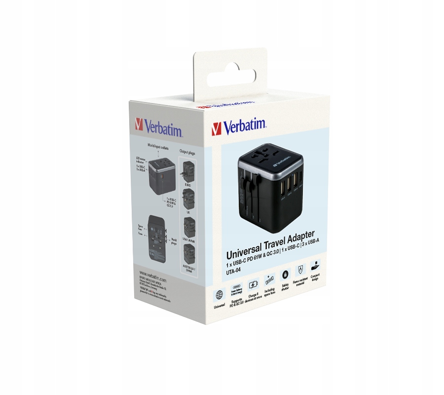 Verbatim UTA-04 globalni potovalni adapter 1× USB-C PD 61W QC 18W, 1× USB-C 12W, 3× USB-A 12W Celoten opis