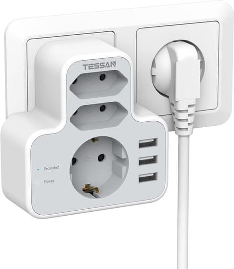Ta kompaktni razdelilnik brez kabla razširi eno vtičnico v tri električne vtičnice in tri USB priključke, kar omogoča hkratno uporabo do šestih naprav. Zaradi premišljenega razmika med vtičnicami je primeren tudi za večje adapterje, brez prekrivanja ali oviranja sosednjih priključkov.