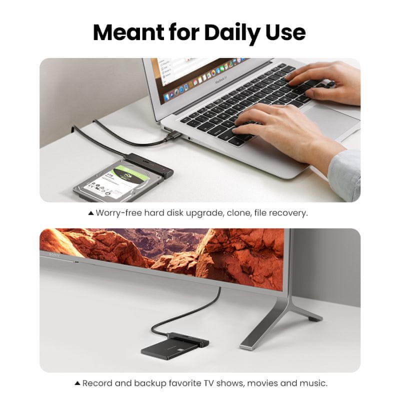 Adapter blagovne znamke Ugreen z USB 3.2 Gen 1 konektorjem za priklop HDD in SSD diskov (samo 2,5) s SATA vmesnikom na računalnik. Najnovejša generacija integriranega vezja, ki podpira tehnologijo USB 3.2 Gen 1, je zagotovilo za super hiter prenos podatkov, zanesljivost in varnost vaše opreme. Za uporabo tega adapterja niso potrebni gonilniki, deluje po principu Plug&Play.<br /><br /><strong>Specifikacije:</strong><br />Priključek: SATA, USB 3.2 Gen 1<br />Material: ABS + PVC<br />Podprte vrste trdih diskov: SSD, HDD<br />Podprte velikosti diskov: 2,5