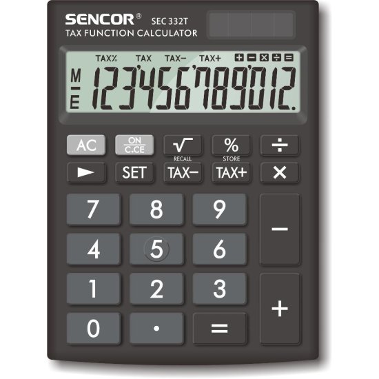 Namizni kalkulator Izjemno velik 12-mestni zaslon LCD Izračun DDV Gumb za popravek Izračun korenov in kvadratov Izračun odstotkov Označevanje decimalne vejice za velikostni red Samodejni izklop Dvojno napajanje (1×LR1130) Dimenzije: 155×115×32 mm (dxšxv) Teža: 120 g