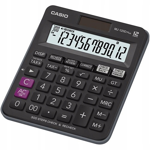 Kalkulator CASIO MJ-120D je opremljen z dvojnim napajanjem iz baterije in sončne energije, 12-mestnim zaslonom in funkcijo samodejnega izklopa. Ima številne uporabne funkcije, ki omogočajo hitre izračune.