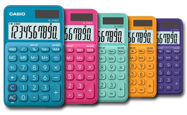 Kalkulatorji v edinstvenih barvah blagovne znamke Casio. Popolni za šolo, pisarno in dom.