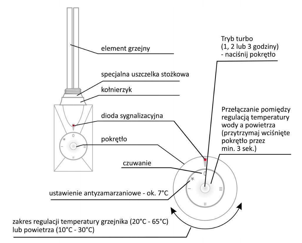 Električni grelec VOLCANO plus je model, zasnovan za kopalniške in sobne radiatorje (npr. aluminijaste, stebrne ali litoželezne). Je idealna rešitev za sušenje brisač ali ogrevanje prostorov skozi vse leto. Ima nastavljivo temperaturo vode v radiatorju (0–65 °C) ali temperaturo zraka v prostoru (0–30 °C). Grelec se lahko namesti v radiator, priključen na centralno ogrevanje, ali pa deluje samostojno (v električnem radiatorju – ni priključen na centralno ogrevanje). Ogrevalni medij je lahko voda ali mešanica vode in glikola. Ima električni priključek – spiralni kabel z vtičem Unischuko ali raven kabel brez vtiča (za fiksno žično povezavo).
