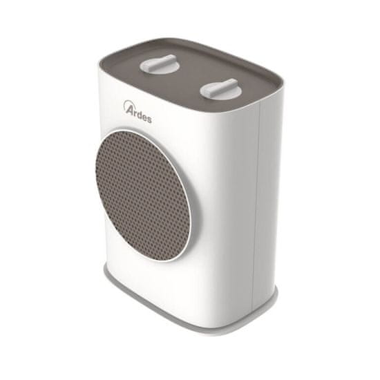 ARDES kermični termoventilator SOUND O. Dve moči delovanja: Eco in Confort. Poletna ventilacija. Zaščita pred prevračanjem in pregrevanjem. Za prostor do 45 m3. Moč: 750/1500W Dimenzije Š/G/V: 17,5 × 13 × 24 cm. Teža kg: 1,5.