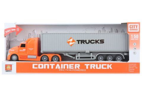 Tovornjak z zabojnikom za akumulatorje. Ko pritisnete gumbe, tovornjak začne oddajati zvoke in se prižge. Velikost tovornjaka je približno 36 × 9 × 6 cm. Dimenzije paketa so približno 39 × 15 × 7,5 cm. Napajanje s 3 baterijami AG13 (priložene). starost 3+