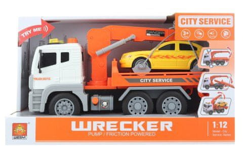 Vlečni tovornjak na baterijski pogon. Ko pritisnete gumbe, avto oddaja zvoke in se prižge. Dimenzije avtomobila so približno 31 × 12 × 10 cm. Dimenzije paketa približno 35,5 × 20,5 × 13,5 cm. Poganjajo ga 3 baterije AG13 (vključene). starost 3+