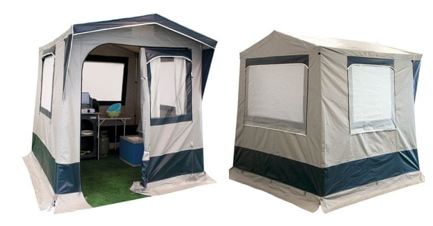Odlična in praktična kuhinja proizvajalca CON.VER. Primerna za pavšalno postavitev (postavitev več kot 6 mesecev letno). Kuhinjo odlikujejo tudi 3 okna s komarniki in roloji. Zelo zračna in hitro postavljiva. Sprednja vrata z oknom in zavesami.