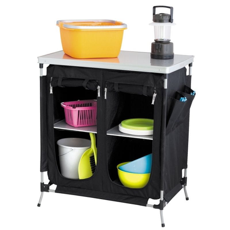 Kamp omarica z močnim aluminijastim okvirjem in veliko delovno ploščo iz MDF z aluminijasto obrobo po vsej strani. Celotna kamp omarica je pakirana v priloženi torbi.