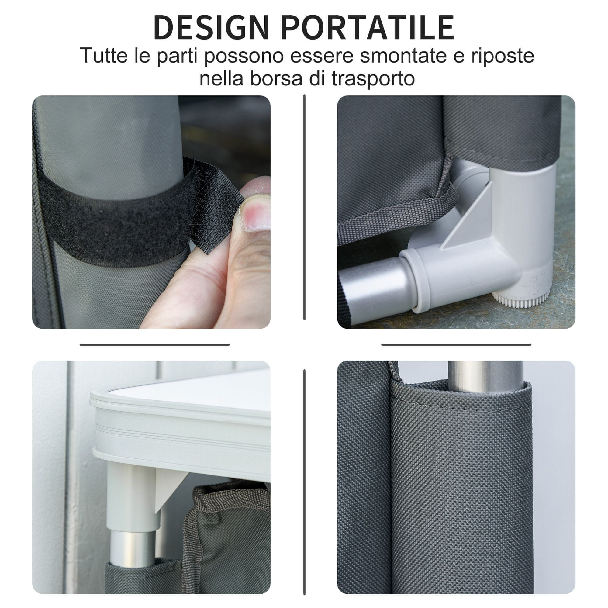 Outsunnyjeva kuhinjska omarica za kampiranje je idealen pomočnik za obroke na prostem. Odlična za opremo za kampiranje, piknik, žar na vrtu in vse druge priložnosti, ko potrebujete trdno mizno ploščo. Ta taborniška miza ima spodaj 2 polici, ki poskrbita za urejenost hrane in pribora. Zaradi zaobljenih vogalov je uporaba varna, zaradi priložene torbe pa enostavna za prenašanje.Vsebine:
