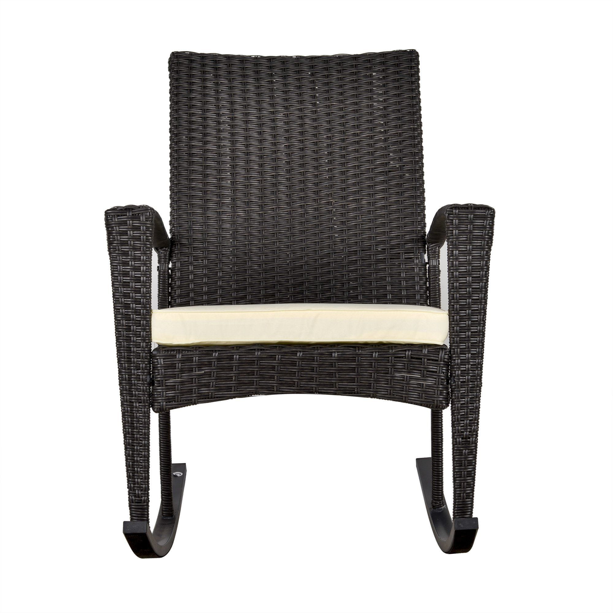 Klasično oblikovan gugalni stol Kovinski okvir z oblazinjenjem iz ratana PE, vzdržljiv, trpežen in enostaven za čiščenje. Širok sedež, visoko naslonjalo in nasloni za roke za največje udobje Oblazinjena blazina s snemljivo in pralno prevleko Ognjevarna tkanina Potrebna je montaža