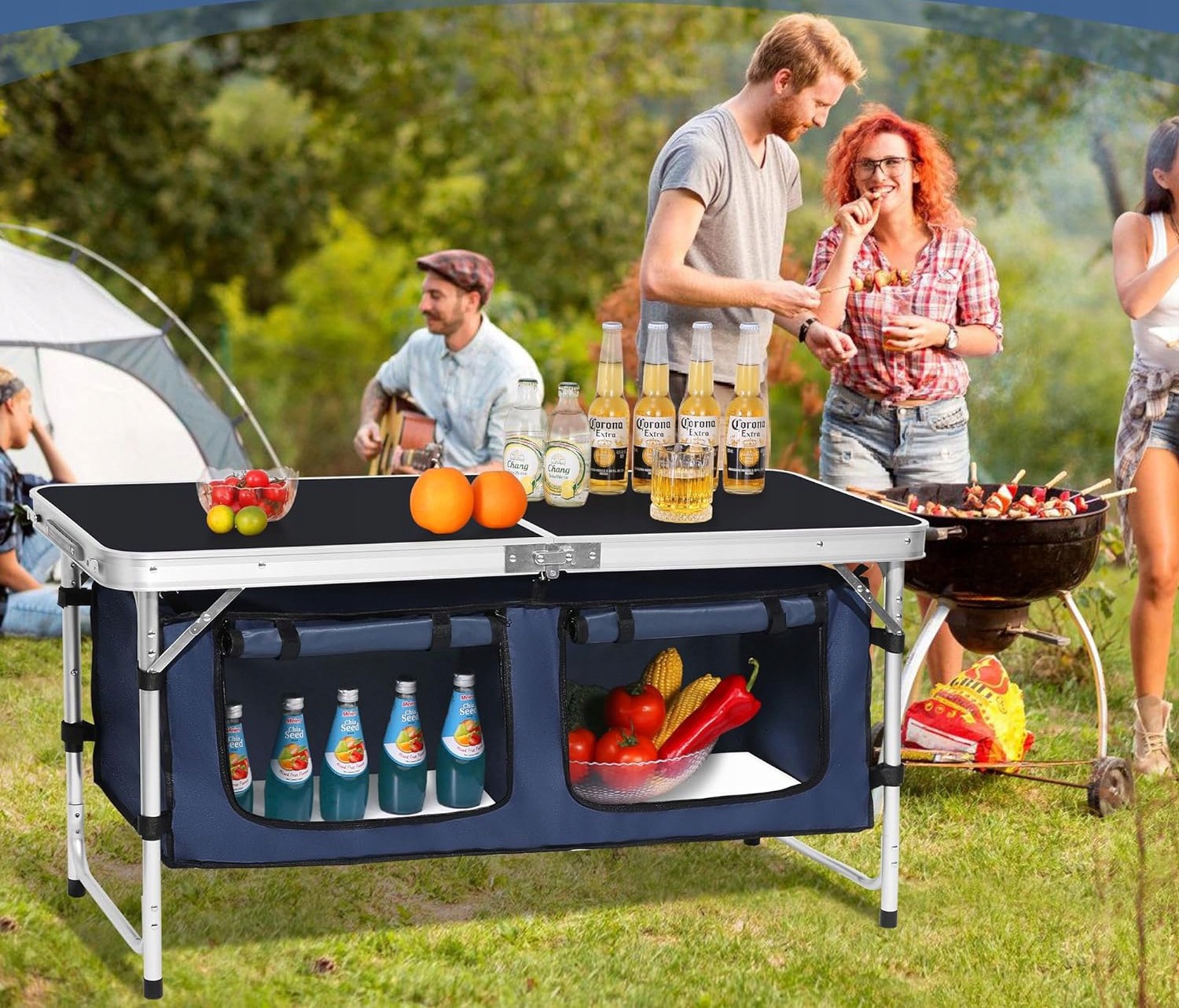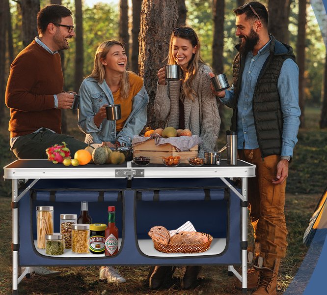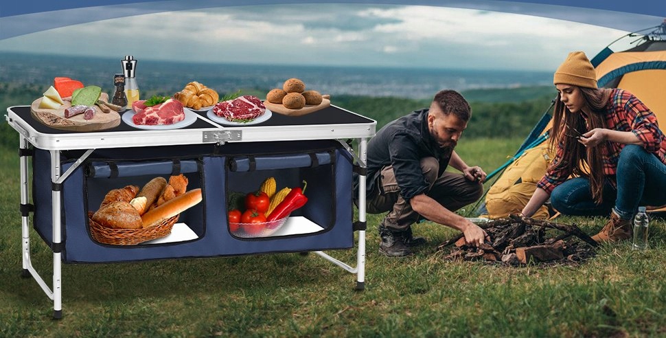 ⭐ Ta zložljiva kamping miza se razloži v nekaj sekundah in zagotavlja stabilno površino za obroke, igre ali druge dejavnosti na prostem. Nosilnost je do 30 kg (66 lbs). Drsne košare ponujajo veliko prostora za shranjevanje in ščitijo vašo hrano pred žuželkami in živalmi.