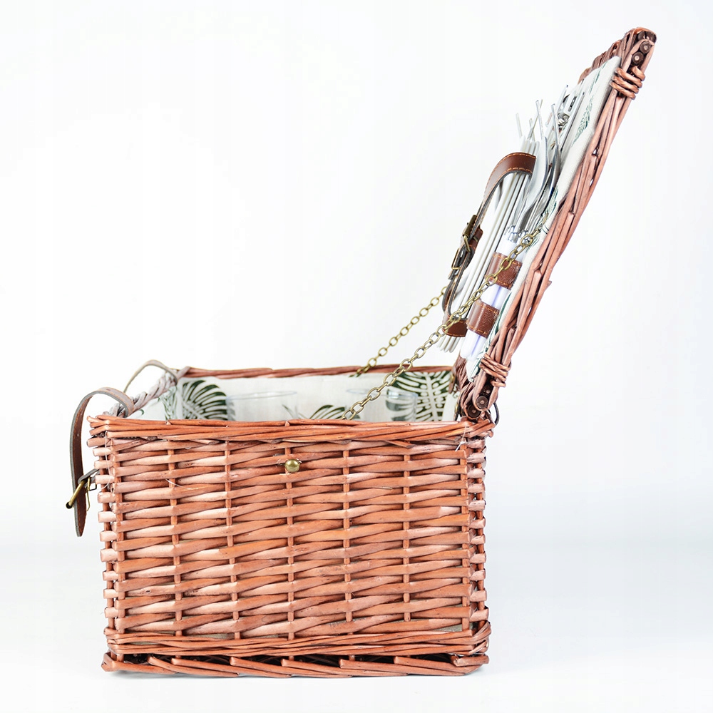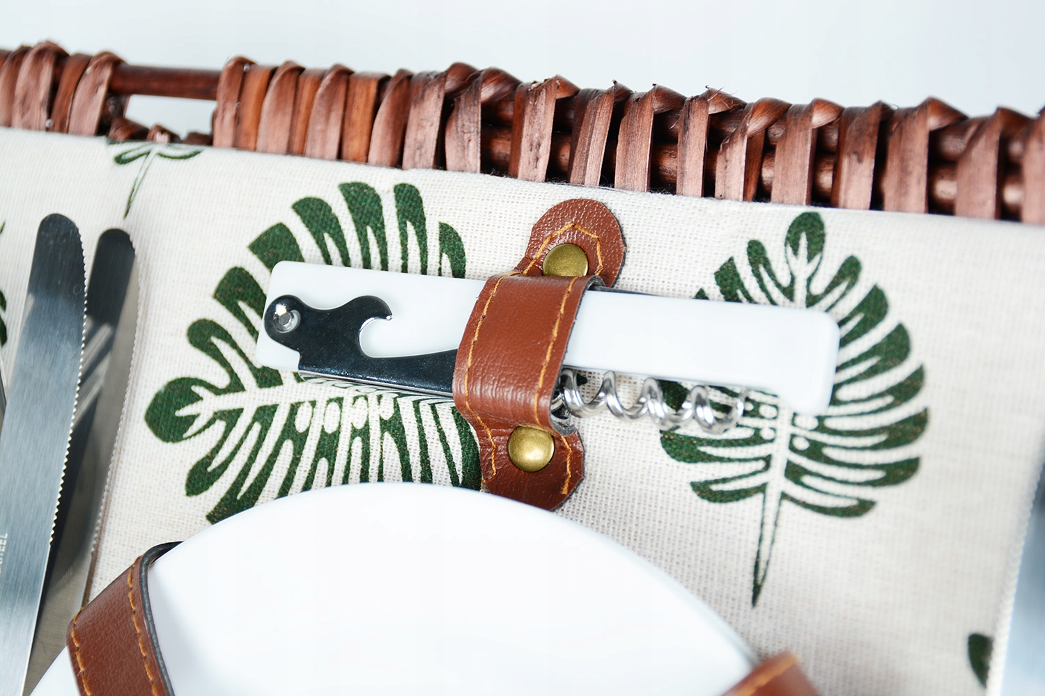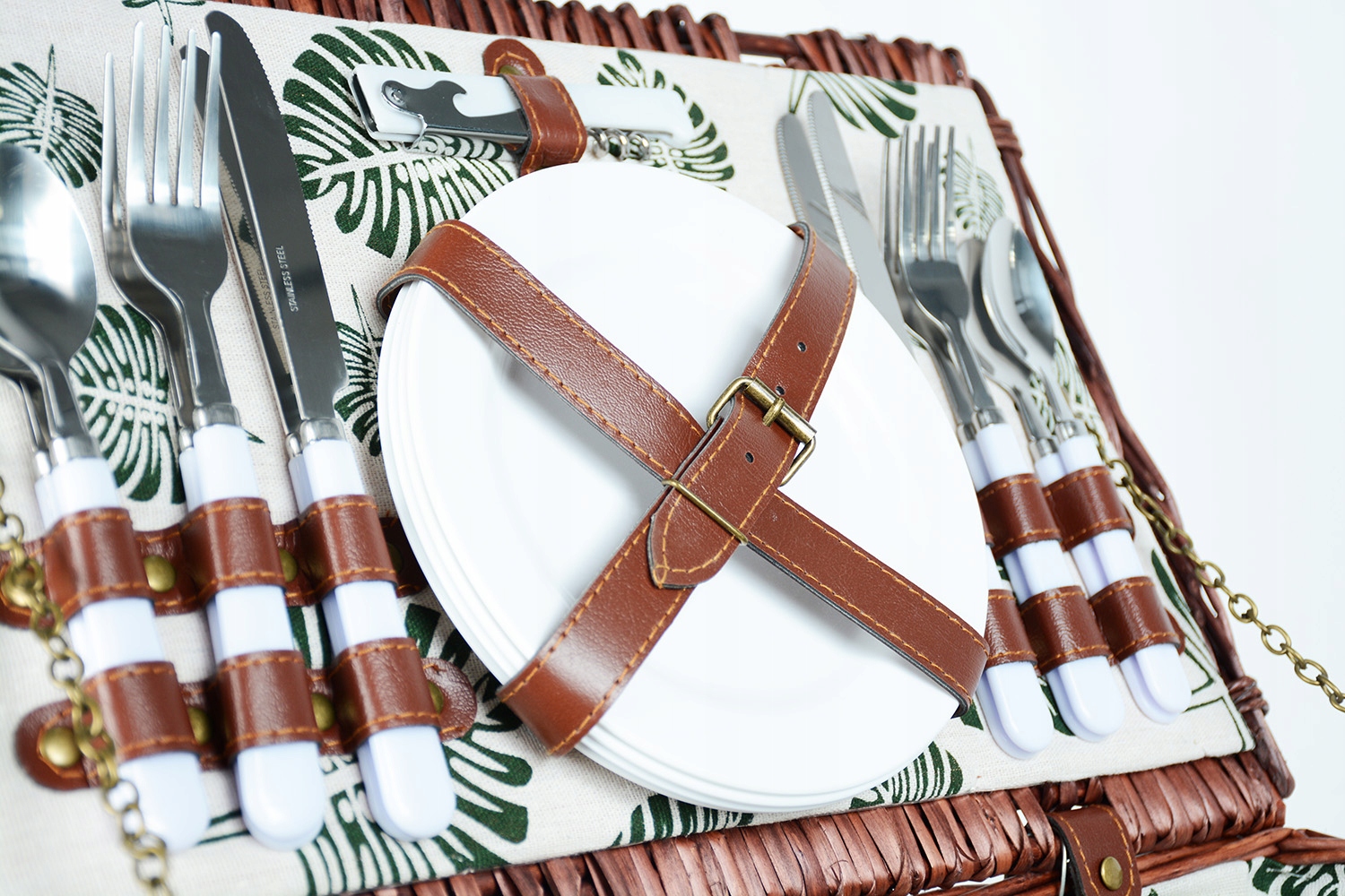 Vaša košara za piknik je zasnovana z mislijo na udobje in varnost. Opremljena je z udobnim ročajem iz eko usnja, zato jo je enostavno prenašati,
