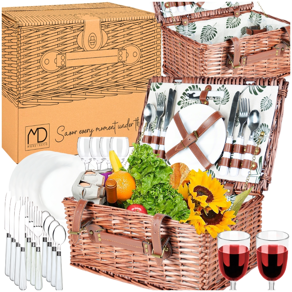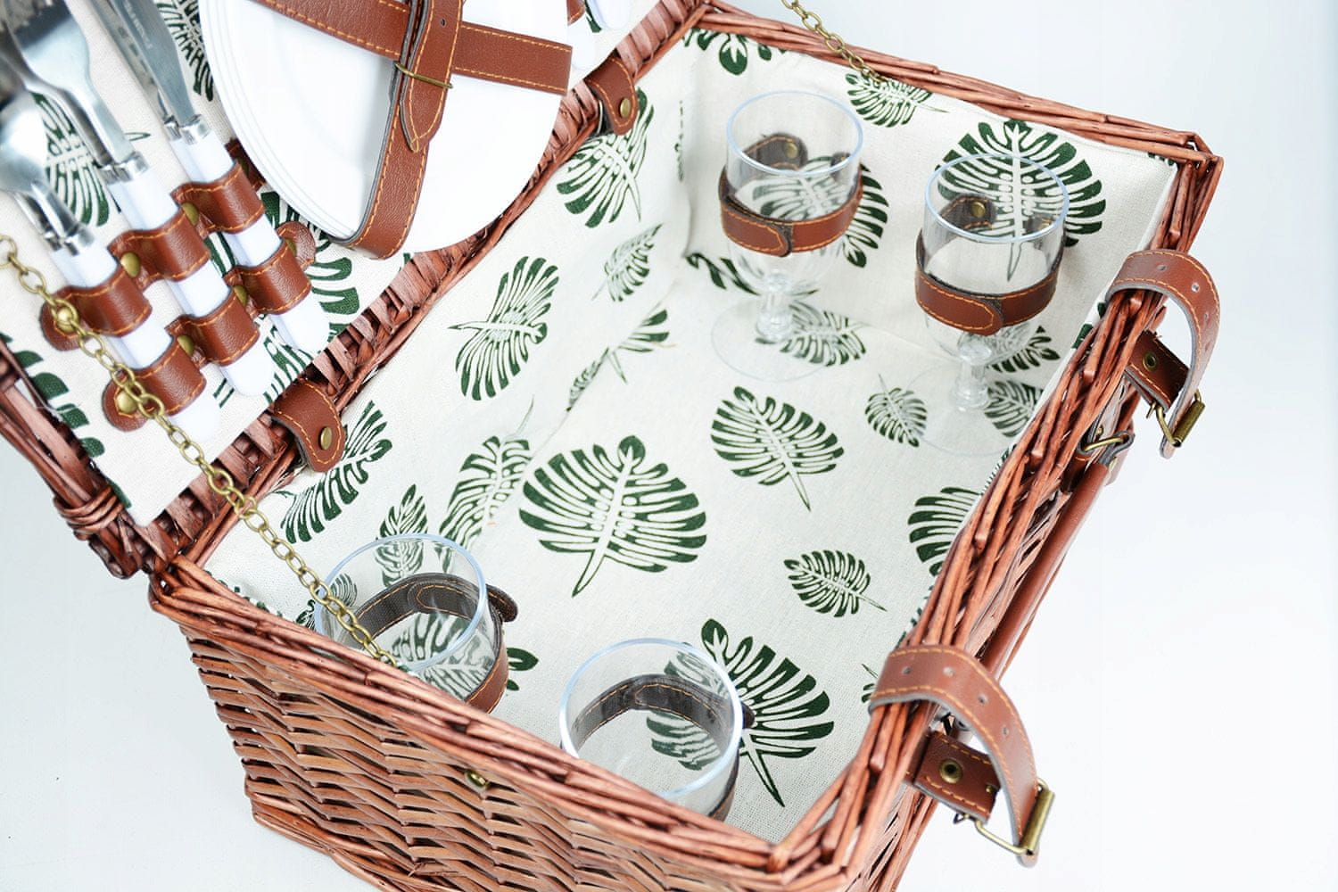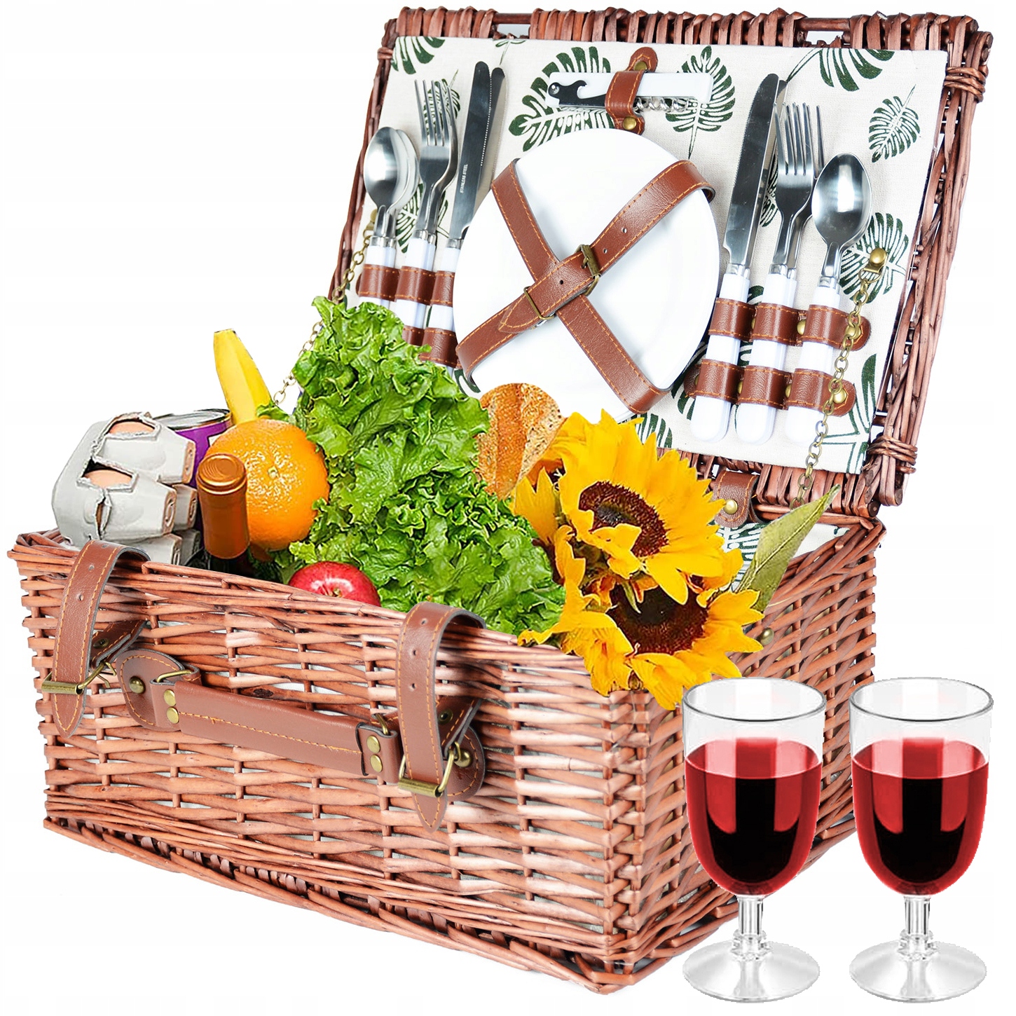 Vaša košara za piknik je zasnovana z mislijo na udobje in varnost. Opremljena je z udobnim ročajem iz eko usnja, zato jo je enostavno prenašati,
