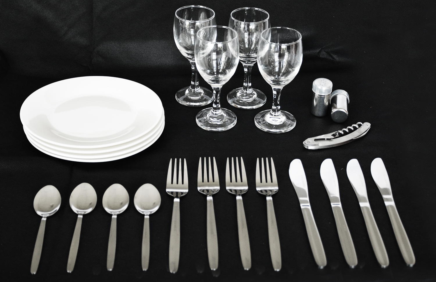 Za 4 osebe: Vključuje vse, kar potrebujete za piknik – jedilni pribor, krožnike, kozarce in celo odpirač za steklenice in zamašek . ✅
