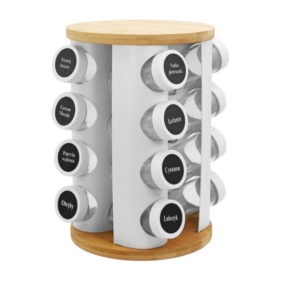 Vrtljivo stojalo iz belo barvanega nerjavečega jekla za 16 posod za začimbe. Zgornji in spodnji del stojala sta iz lesa.