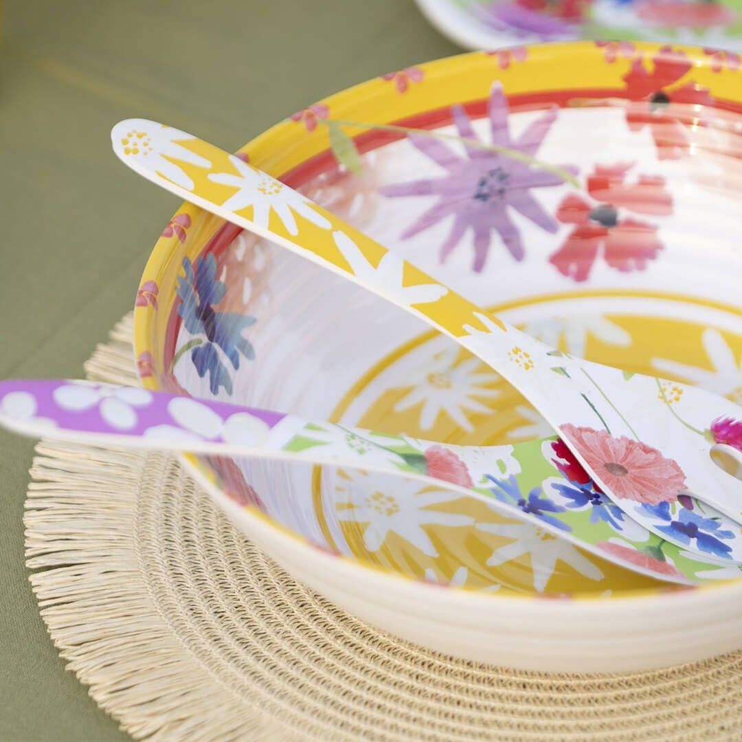 Okrogla skleda Floreal je popoln zaveznik za vnos svežine in barv na mizo. Izdelana je iz trpežnega in lahkega materiala ter okrašena z živahnimi cvetličnimi motivi, ki prikličejo pomladno vzdušje. Idealna je za praktično in elegantno serviranje solat, hladnih testenin ali prilog, tako v zaprtih prostorih kot na prostem. Melamin je lahek in zelo odporen na udarce, saj se težje se razbije kot porcelan ali keramika, zato je idealen tudi za vrtne zabave ali piknike. Skleda je primerna za pomivanje v pomivalnem stroju.