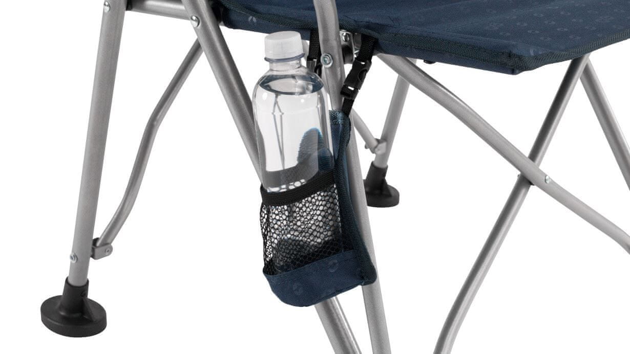 Stol s stabilnim okvirjem iz prašno lakiranega jekla in trpežne poliestrske tanine. Nudi hitro odpiranje in zlaganje na manjšo velikost za lažje prenašanje s priloženo torbo. Ponaša se z oblazinjenimi nasloni za roke, odstranljivim držalom skodelic in ploščatimi nogami za brezskrbno sedenje na mehkih površinah.