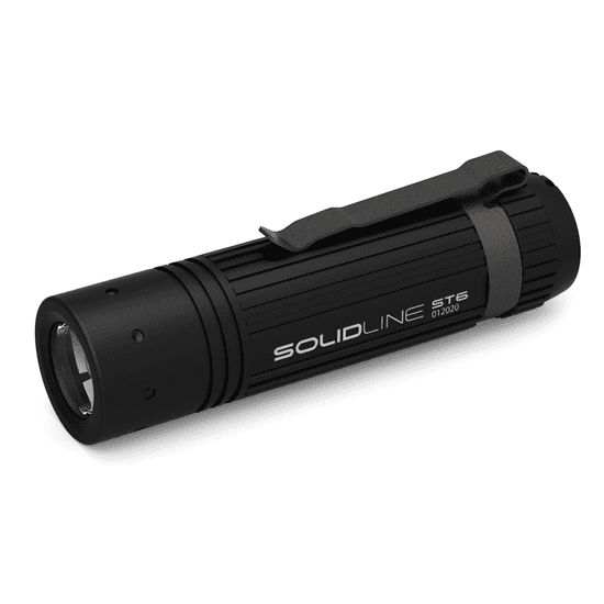 Kompaktna svetilka v visokokakovostnem in priročnem aluminijastem ohišju je opremljena s sistemom za nadzor ostrenja, napajajo pa jo tri baterije AAA. Zaradi tega je Solidline ST6 kompaktna vsestranska svetilka za vsakogar. S kovinsko sponko lahko svetilko enostavno pritrdite na kamorkoli. Stikalo Endcap pa zagotavlja enostavno upravljanje. ST6 prepriča z odličnim razmerjem med ceno in zmogljivostjo.
