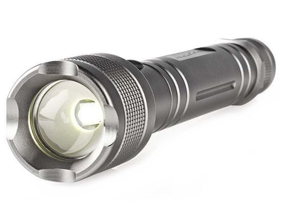 Trdna svetilka LED v aluminijasti zasnovi za vsakodnevno uporabo. Moč LED diode je 10 W in tako ponuja svetilnost do 500 lm. Z 9,5° kotom snopa ponuja doseg do 250 m. Zadovoljni boste tudi s povečano odpornostjo svetilke v skladu s standardom IPX4. Tri celice C/LR14 (niso priložene) zagotavljajo do 5 ur zmogljivosti.