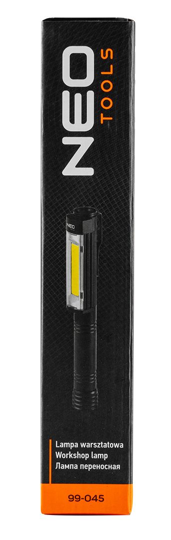 Inšpekcijska svetilka NEO (ref. 99–045) je baterijska inšpekcijska svetilka COB LED z močjo 4 W in svetilnostjo 400 lumnov. Magnet na podstavku in sponka za žep omogočata upravljanje z obema rokama. Ima tri načine svetlobe: 100 %, 50 % in rdečo.