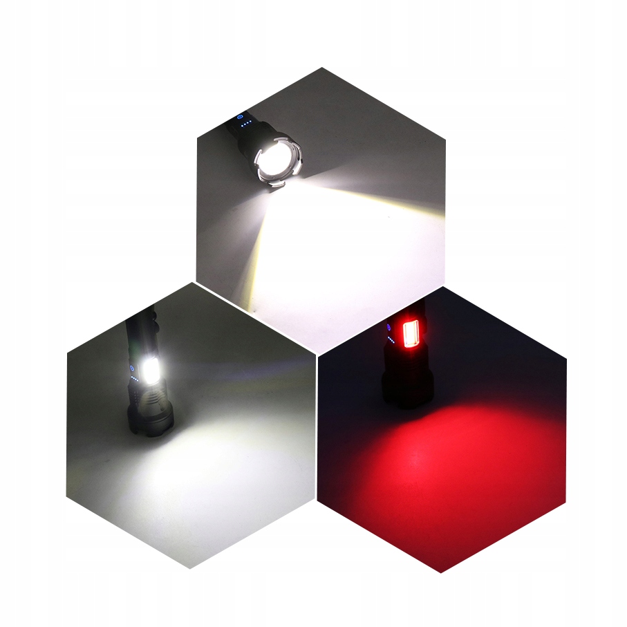 6 načinov osvetlitve- 100% / 50% / SOS / COB bela luč / COB rdeča luč / COB utripajoča rdeča luč