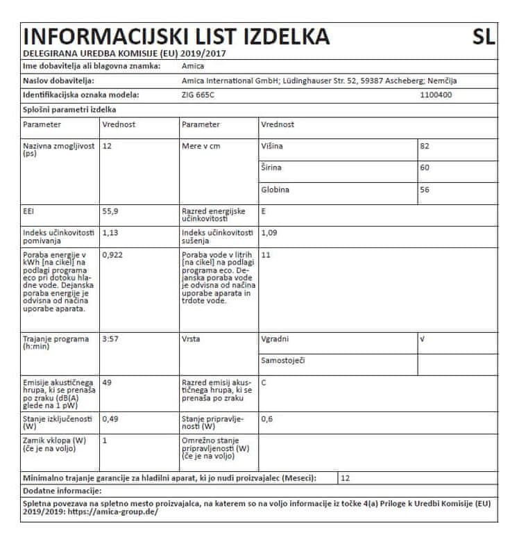 Amica vgradni pomivalni stroj ZIG 665C (1100400) ima zmogljivost pomivanja 12 pogrinjkov in se uvršča v energijski razred E.