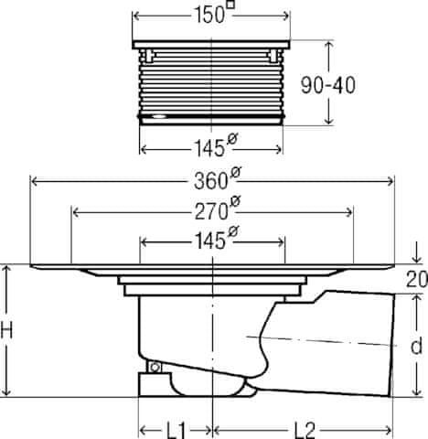 Talni odtok Advantix – velikost sistema 145 Oprema tesnilna prirobnica, vrtljiv in višinsko nastavljiv podaljšek 150 × 150 mm, čep, plastični okvir, rešetka iz nerjavečega jekla 1.4301, odstranljiva smradnica Tehnični podatki razred obremenitve K – 300 kg kontrola kakovosti po DIN EN 1253 model 4955.1 člen 557 164 DN: 70 zmogljivost odtekanja pri gladini vode 10 mm: 0,6 l/s zmogljivost odtekanja pri gladini vode 20 mm: 1,1 l/s horizontalni odtok