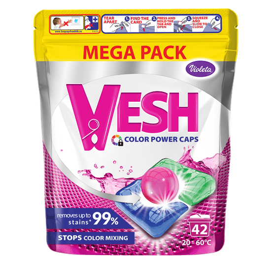 Vesh Color Power pralne kapsule z vgrajenimi komponentami, ki ohranjajo intenzivnost barv in teksturo tkanin ter dajejo oblačilom izjemno mehkobo in svežino. Učinkovito in enostavno odstranijo najtrdovratnejše madeže že pri temperaturi 20 °C.