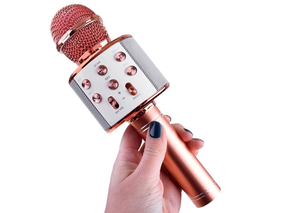 Bluetooth mikrofon za karaoke – mikrofon z osvetljenim zvočnikom, omogoča poslušanje skladb iz vašega telefona se poveže z zunanjimi napravami (npr. telefon, tablica, SMART TV z operativnim sistemom ANDROID ali IOS). Brezžični mikrofon s povezavo Bluetooth je odličen način, da razburkate vsako zabavo, pa naj gre za otroško zabavo, srečanje s prijatelji na karaokah ali za učenje petja v udobju lastne sobe. Prek povezave Bluetooth ga lahko povežete s telefonom, televizorjem ali tabličnim računalnikom, kar vam omogoča veliko možnosti za odlično zabavo. Ko je priključen, bo predvajal glasbo iz ustrezne naprave po enakem načelu kot brezžični zvočnik.