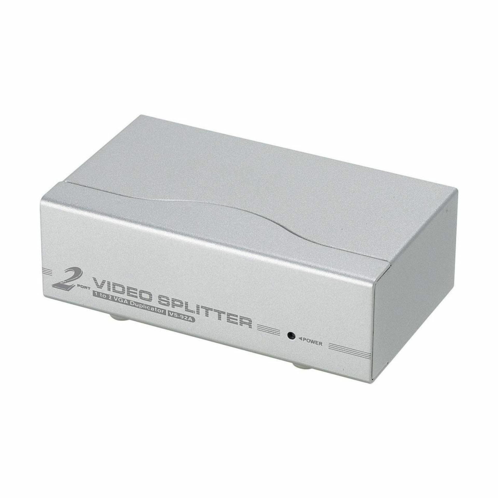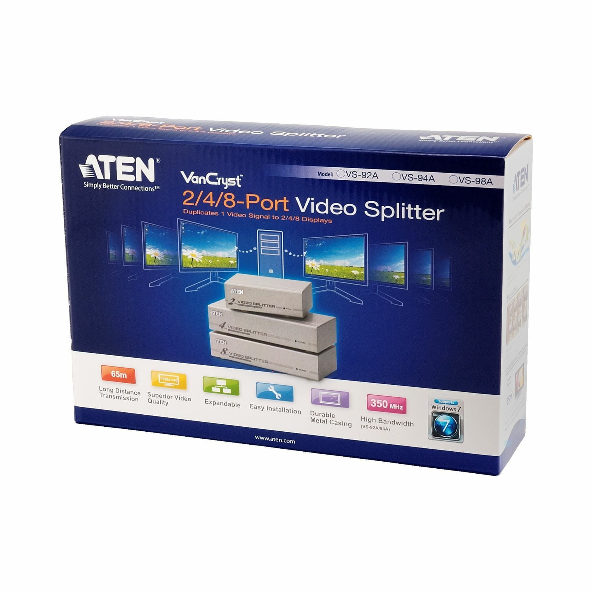 Aten množilnik SVGA VS92A signal iz enega računalnika na dva analogna zaslona, 1 HDB-15 moški video vhod na 2 HDB-15 ženski video izhod. Celoten opis
