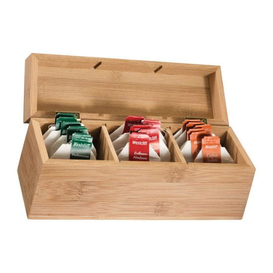 Lesena škatla za čaj ali čajne vrečke je eleganten dodatek vaši kuhinji. Zaradi izjemno natančne izdelave, škatla odlično tesni, tako da je vsebina zaščitena pred vlago in svetlobo. Škatla ima dva prekata, tako da je primerna za 3 različne vrste čajev. Čaji niso priloženi.
