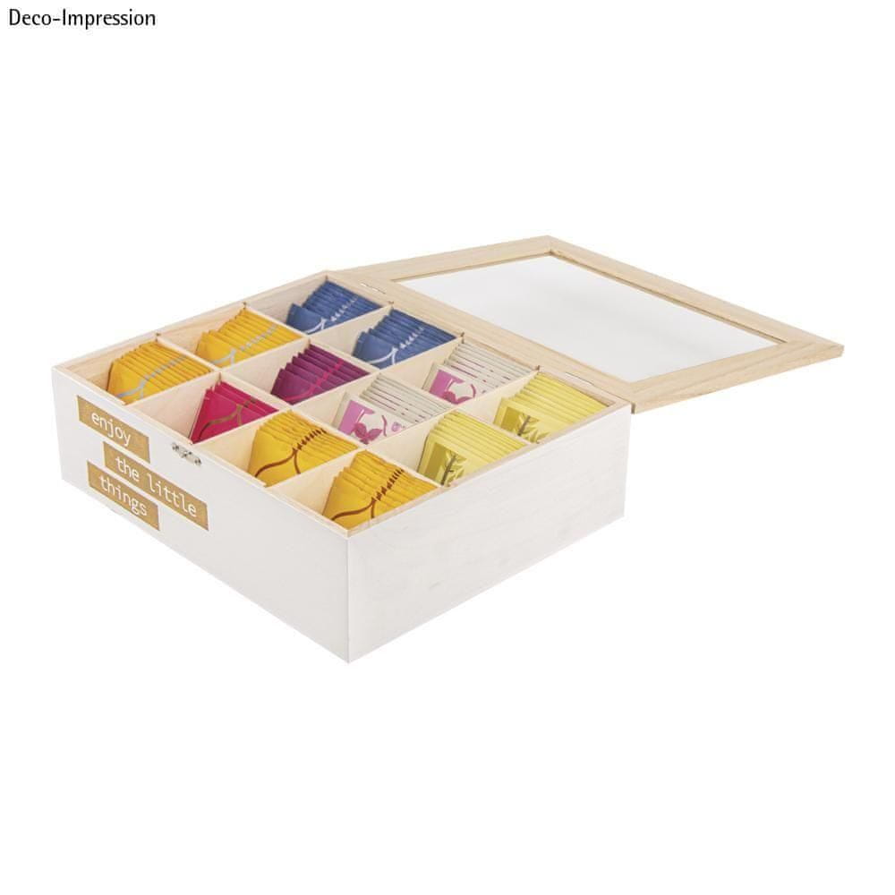 Lesena škatla za čaj ima 12 razdelkov za čajne vrečke. Velikost predala 6,5 ??x 7 cm, višina 7 cm (velikost klasične vrečke za čaj je cca 5.5×6.5cm)