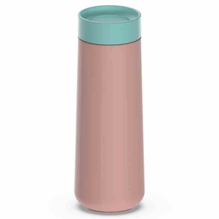 potovalna skodelica s prostornino 350 ml, – odpiranje s priročnim gumbom, – 360° skodelica – omogoča pitje kot iz kozarca, – ne pušča, – ohranja nizko vsebino 12 ur, – ohranja visoko vsebino za 6 ur, – plastika brez plastike (brez BPA in PVC, brez ftalatov), – možnost recikliranja, – ustreza standardnim držalom za skodelice, – vitka in elegantna oblika, – zasnovana za ročno pranje, – ni primerna za mikrovalovne pečice, – ni priporočljivo je, da skodelico postavite v zamrzovalnike. Mere: Premer: 7 cm Višina: 19,6 cm Material: visokokakovostno nerjaveče jeklo Barva: pudrasto roza, mint