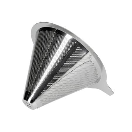 Ključne lastnosti: – Praktičen – omogoča pripravo približno 900 ml kave brez papirnatih filtrov – Termoska z vijačnim pokrovom – dolgo ohranja temperaturo in vam omogoča, da svojo kavo vzamete s seboj, kamor koli želite – Enostaven za uporabo – nalijte, natočite, počakajte in končali ste! – Izdelan iz trpežnih in za živila varnih materialov – Oblika Napravo odlikuje preprosta, minimalistična oblika in kakovostni materiali. Sestavljen je iz termosa z vijačnim pokrovčkom, ročaja, ki se ne segreva, steklenega kapljalnika in filtra. – Termos ima prostornino 1 l, njegove stene so izdelane iz nerjavnega jekla z bakreno izolacijo, privijači se, je prenosen in ohranja napitek na visoki temperaturi do 12 ur. – Kapalnik je izdelan iz visokokakovostnega borosilikatnega stekla. – Droben in gost mrežast filter zadrži delce kave v notranjosti, da je napitek čist. Filter je snemljiv, zato njegovo čiščenje ni težava. Kako uporabljati Priprava kave je izjemno preprosta in vam vzame le nekaj minut: 1. Odmerite pravo količino srednje mletega kava (6 g kave na 100 ml vroče vode). 2. Kavo vlijte v filter, ki je nameščen v dripperju. 3. Kavo prelijte s približno 50 ml vroče vode in počakajte 30 sekund. 4. Počasi dolijte preostanek vode. 5. Gotovo! Zaradi elegantne embalaže je izdelek odlična ideja za darilo.