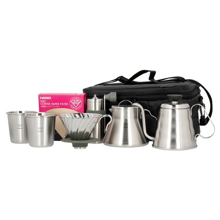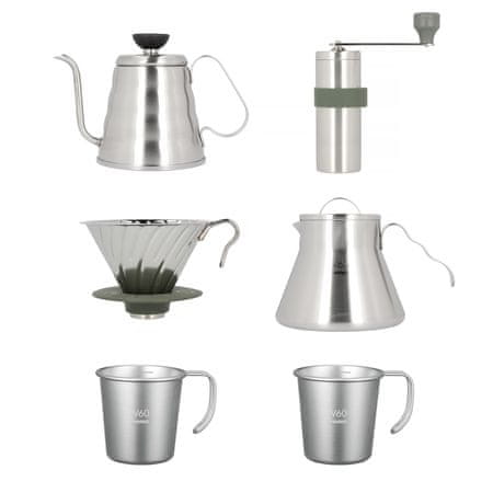Set vsebuje:- Hario Metal Drip V60–02 Outdoor Silver s silikonskim stojalom (O-VDM-02-HSV):Ročni aparat za pripravo kave po metodi pour-over.Hario V60–02 omogoča pripravo kave za eno ali več oseb. Kovinska različica vsekakor navdušuje s svojo obliko – popolna kombinacija ekstravagantnega dizajna in funkcionalnosti. Odlikujejo jo zelo dobra stopnja zadrževanja toplote ter lahka in robustna konstrukcija. Stožčasta oblika in posebni utori na notranji strani kapljalnika zagotavljajo odličen pretok vode. Kapljalnik je opremljen s silikonsko podlago za boljše prilagajanje posodi, na katero je nameščen. Zaradi uporabe trpežnih materialov je ta kapljalnik odličen ne le doma, temveč tudi med kampiranjem ali potovanjem. -Hario – V60 Metal Outdoor Coffee Mill – mlinček za kavo (O-VMM-1-HSV): Hario V60 Metal Outdoor Coffee Mill. Mlinček je robusten, kompakten in ponuja širok razpon debelin mletja. Stožčasti keramični mlinčki zagotavljajo enakomerno mletje, ne vplivajo na okus kave in so odporni na obrabo. Z nastavitvijo stopnje mletja lahko mletje prilagodite izbranemu načinu kuhanja – od finega mletja, na primer za Aeropress, do grobega mletja za French Press. Stopnjo mletja lahko postopoma, hitro in enostavno nastavite z gumbom pod žerjavico. Ohišje je v celoti izdelano iz nerjavečega jekla, zato je mlinček vzdržljiv. Dodatni sestavni deli so izdelani iz plastike, primerne za živila. Za lažje shranjevanje lahko snemljiv ročaj pritrdite na trak na ohišju. Zaradi majhne velikosti je mlinček odličen za potovanja. Mlinček je izdelan na Japonskem po najvišjih standardih, zato je zanesljiva izbira za prihodnja leta. – Hario V60 Outdoor Stainless Steel Server 500ml (O-VCSM-50-HSV): Harijev strežnik iz nerjavečega jekla za serviranje kave in čaja. Vrč je v celoti izdelan iz visokokakovostnega nerjavnega jekla, zato vam ni treba skrbeti, da bi se razbil – zato je to nakup, ki bo trajal več let. Z ustreznim premerom odprtine (7,8 cm) je združljiv z vsemi kapalkami Hario V60. Dodatna prednost strežnika je, da ga lahko uporabljate tudi kot čajnik za kuhanje vode. V njem lahko brez težav segrevate vodo na plinskem ali električnem gorilniku. Vendar pa strežnik ni združljiv z indukcijskimi ali mikrovalovnimi pečicami. skupna prostornina: 700 ml uporabna prostornina: 500 ml -Hario Outdoor V60 Metal Drip Buono Kettle – Kettle 700ml (O-VKB-70-HSV):Čajnik za kuhanje vode s profiliranim vratom, ki je še posebej uporaben pri pripravi kave z alternativnimi metodami, kot so Drip, Chemex ali Aeropress. profilirano vratce vam omogoča popoln nadzor nad pretokom vode. Tako imate nadzor nad hitrostjo nalivanja in nad tem, kam usmerjate vodo. Minimalistična in industrijska zasnova ter natančnost nalivanja vsekakor razlikujejo kuhalnik Buono od običajnih kuhalnikov. skupna prostornina: 700 ml uporabna prostornina: 500 ml – Hario – Outdoor V60 Metal Stacking Mug – Two 320ml Steel Mugs (O-VSM-30-HSV):Dva jeklena vrča Hario Outdoor.Vrč je izdelan iz nerjavečega jekla, zato je vzdržljiv. Če imate več vrčev, lahko enega postavite v drugega za lažje shranjevanje in prihranek prostora. Oblika ročaja vam omogoča tudi, da lahko vrč pripnete ali zvežete. Skupna prostornina je 320 ml. Vrč ima na notranji steni oznako, ki označuje 300 ml. -Hario – rjavi papirnati filtri Misarashi – V60–02 – 40 kosov (VCF-02–40M): pakiranje 40 kosov papirnatih filtrov za kavo, primernih za kapljalnik Hario V60–02. Narejeni so iz naravnega rjavega papirja. Zagotavljajo čisto pripravo kave brez usedlin in odličen pretok vode. Izdelano na Japonskem -Hario – V60 Outdoor Coffee Bag – Accessory Bag (O-VCB-B): torba za shranjevanje dodatkov za kuhanje kave. Priročno in varno prenašanje opreme za kavo na poti ne bo več težava! Izdelana je iz trpežnega poliestra, ki ga je enostavno očistiti. Zapenja se z zadrgo in je notranje razdeljena na dva predala. Zgornji predel je ločen z drugo zadrgo in razdeljen na dva dela – vanj lahko shranite na primer zavojček kave in tehtnico. Spodnji, večji predal je razdeljen na pet delov in vanj zlahka spravite kapalko, strežnik, čajnik, mlinček in skodelico. Poleg tega je v poklopcu zaprt predal za filtre. torba meri 33 cm x 29 cm x 17 cm (širina x globina x višina). Za udobno prenašanje je torba opremljena s kratkim in dolgim snemljivim ročajem.