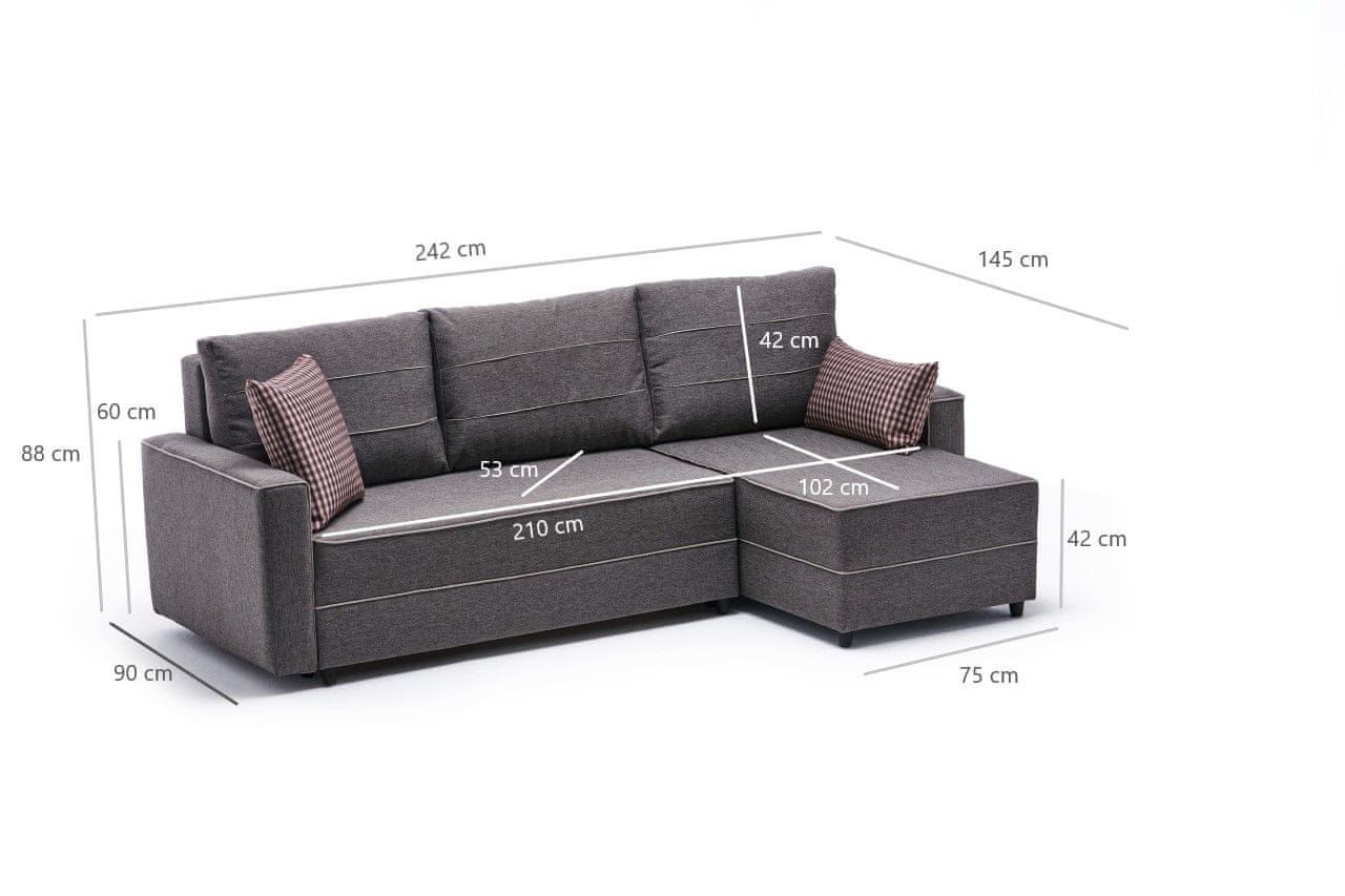 Okvir: FIR TREE & MDF Tkanina: 100 % POLYESTER Širina: 242 cm Višina: 88 cm Globina: 90 cm Velikost postelje: 200 × 150 cm Globina sedeža: 72 cm Višina sedeža: 42 cm Dolžina sedeža: 210 cm Višina naslona: 42 cm Višina nog: 5 cm 28 DNS pena za sedenje Partikularna pena za hrbet Lesene noge Enostavno čiščenje tkanine Število paketov: 2 80 × 90 × 140 cm / 34 kg (1 kos) 80 × 90 × 157 cm / 33 kg (1 kos)