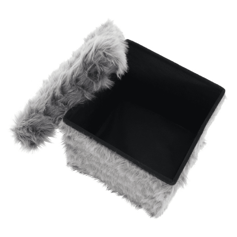 Krznen stolček s prostorom za shranjevanje VASAV Material: umetno krzno Odpornost tkanine proti obrabi po testu Martindale: 87.000 odrgnin Barva: temno siva Dimenzije (ŠxGxV): 37,5×37,5×38 cm Višina sedeža: 37,5 cm Globina sedeža: 37,5 cm Nosilnost: 100 kg Dobavljeno v razstavljenem stanju. Celoten opis
