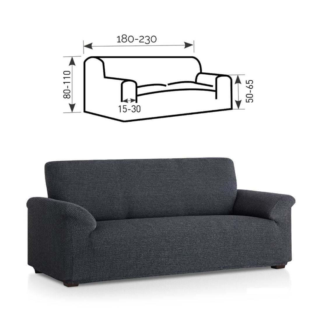Prevleka je primerna za trosede s širino od 180 cm do 220/230 cm ter do višine približno 100 cm. Maksimalne dimenzije, ki smo jih podali za določeno vrsto prevleke, so največje možne mere, ko se prevleka raztegne. Če jih presežete celo za 5 cm, se prevleka ne prilega. Prevleka je pakirana v torbi za večkratno uporabo, v kateri lahko shranjujete oddeje ali oblačila.