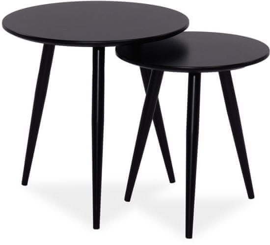 Komplet dveh okroglih mizic za kavo. Zgornja stran je izdelana iz visokokakovostnega MDF, noge mize pa so kovinske. Mize so črne. MDF je večplastna plošča, na katero je z visokim pritiskom stisnjena PVC-folija. Je barvno obstojna, vodoodporna in zelo enostavna za vzdrževanje. Dobavljamo v razstavljenem stanju.