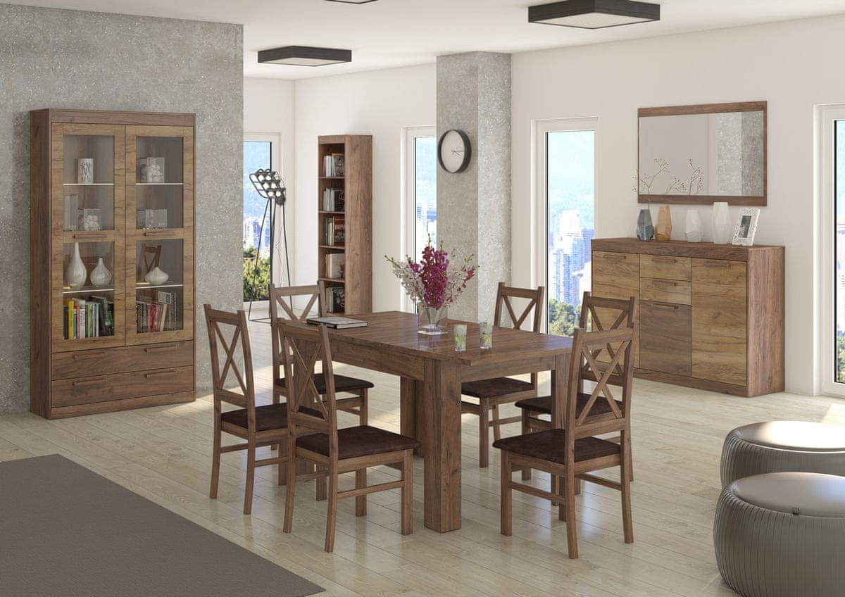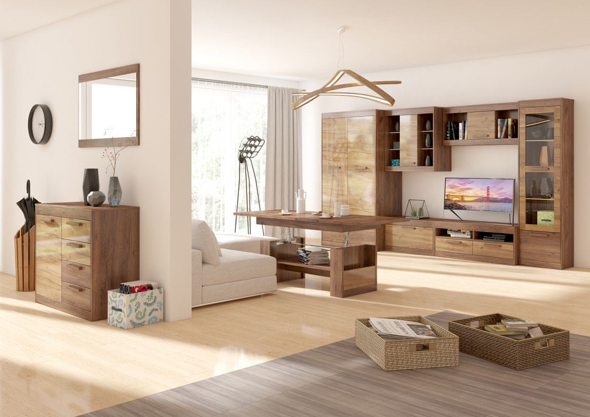 Konferenčna miza MAXIMUS MXS-16 je praktična miza skupaj s polico za shranjevanje pod zgornjo ploščo. Na levi in desni strani mize je še en oplemeniten odlagalni prostor za shranjevanje knjig in revij. Izdelan je v barvni kombinaciji craft tobacco / craft gold in se lahko kombinira z elementi kolekcije Maximus. Njene dimenzije (ŠxGxV): 125×68×53 cm. Sanjate o modernem in barvno usklajenem domu? Sistem Maximus je pravi za vas. Je univerzalna, detajlna kolekcija, ki s svojim dizajnom in strukturo površine iverne plošče ustvari masiven vtis. Material za izdelavo elementov je visokokakovosten laminiran DTD, ki je visoko odporen na poškodbe. Delovna plošča in mizne noge so izdelane v debelini 25 mm, ostali deli pa v debelini 16 mm. Vrata in predali imajo barvno usklajene vodoravne ročaje, ki olajšajo rokovanje z njimi. Izbrane barvne različice v kombinaciji z belo sijajno različico delujejo razkošno in sveže. Posamezne elemente kolekcije Maximus je mogoče kombinirati in lepo med seboj, zahvaljujoč paleti barvnih kombinacij, tako da lahko okrasite svojo dnevno sobo, študentsko sobo, jedilnico, pisarno ali hodnik. V primeru zanimanja je možen tudi nakup LED razsvetljave v različnih barvah.
