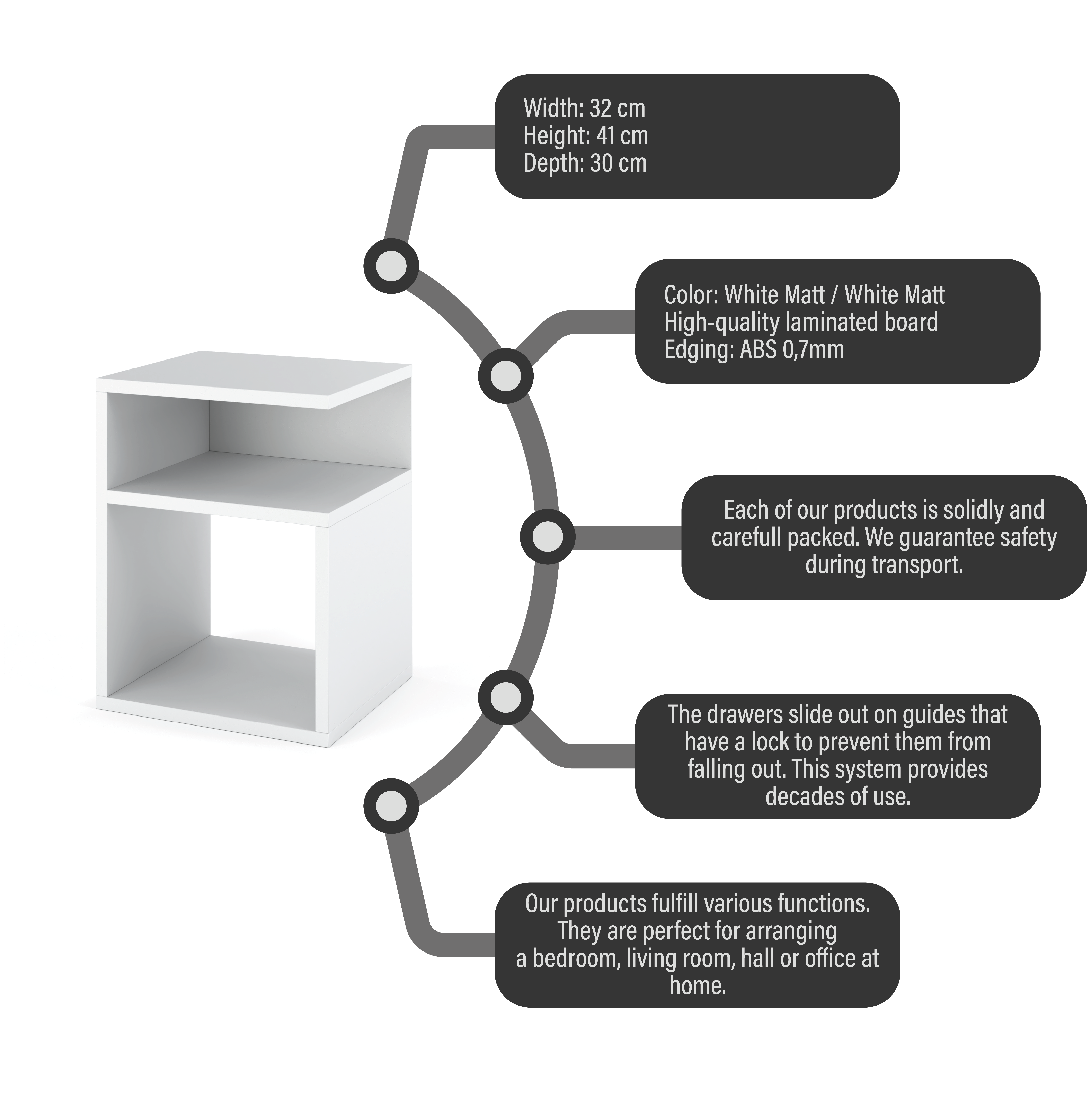 - Eleganten dizajn:Zaradi bele barve in modernega videza se naša nočna omarica odlično prilega različnim notranjim dizajnom ter ji doda eleganco in značaj.