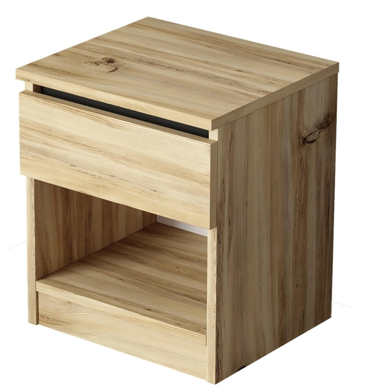 Ta praktična nočna omarica, ki združuje funkcionalnost in estetiko, je popoln dodatek za vsako spalnico. Izdelan je iz trpežnega melamina, ki posnema naravni les s toplimi vlakni, vsakemu interierju doda udoben in moderen pridih. Ima prostoren predal za shranjevanje majhnih predmetov in odprto polico, idealno za knjige, okraske ali nočno omarico. Predal je opremljen z drsniki s krogličnimi ležaji, ki zagotavljajo gladko, tiho in vzdržljivo delovanje, tudi pri intenzivni uporabi. Zaradi svojih kompaktnih dimenzij je idealen za manjše prostore, hkrati pa zagotavlja popolno udobje. Preprost, a eleganten dizajn dopolnjuje notranje stile, kot so skandinavski, boho ali rustikalni. Je odlična izbira za tiste, ki cenijo praktičnost in estetiko. Mere: Višina: 46,3 cm Širina: 40 cm Globina: 35,5 cm