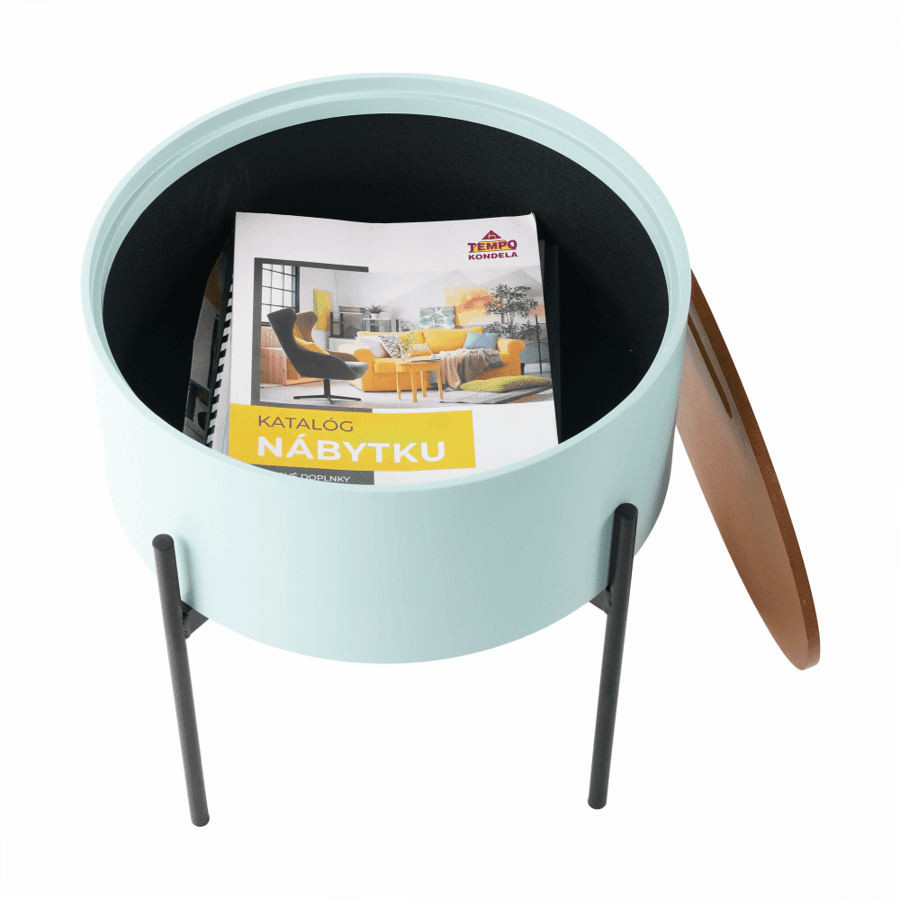Material: mdf / kovina Barva: neo mint / naravna / črna Dimenzije (ŠxGxV): 38×38×38,5 cm Nosilnost: 30 kg odstranljiv pokrov S predalom za shranjevanje Dobavljeno v razstavljenem stanju Celoten opis